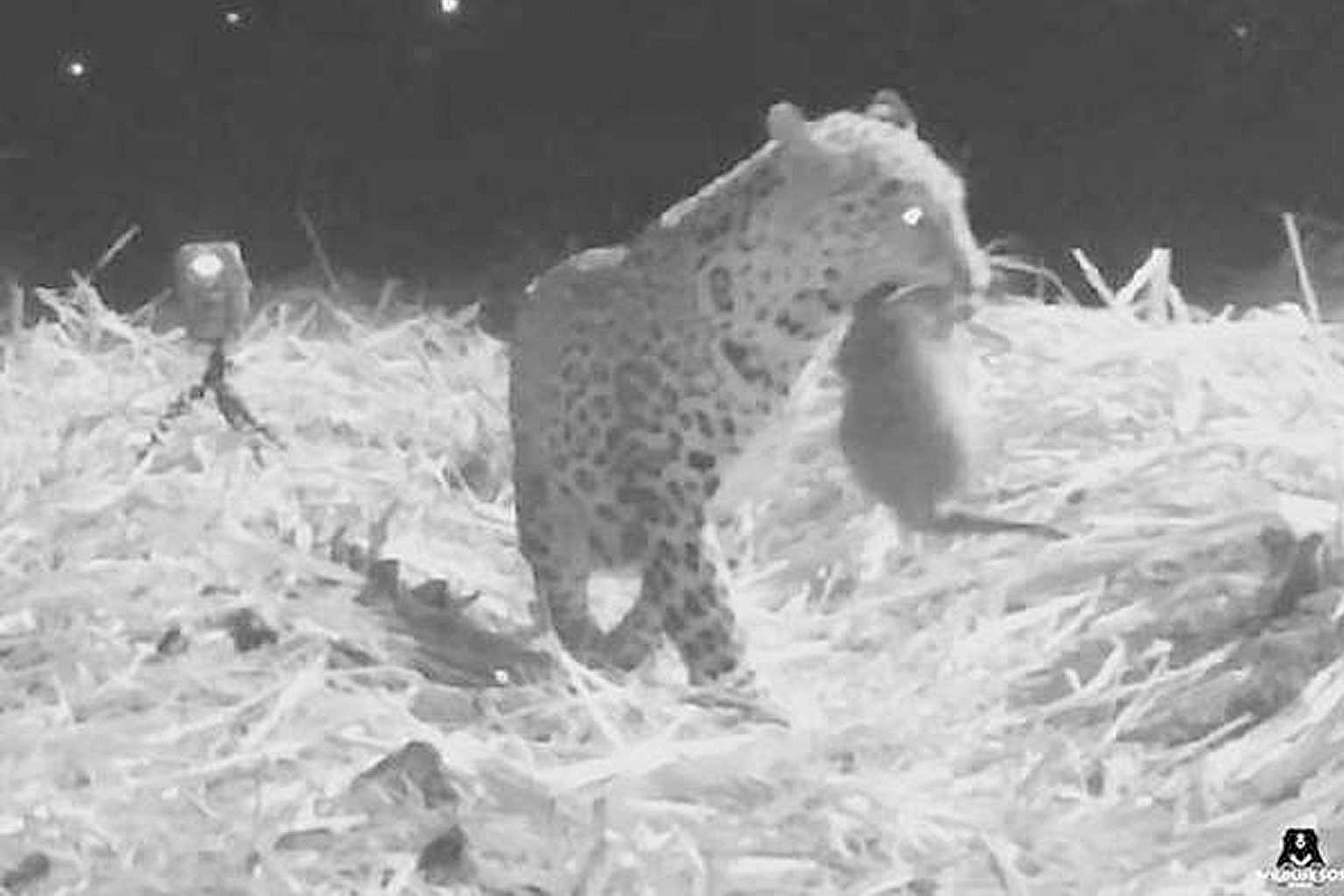 ▼通過隱藏鏡頭,可以看到豹媽媽在夜晚來到農田尋找著,但牠非常警惕小心查看塑料盒中的東西。結果豹媽媽將盒子翻過來,然後把小幼豹放在嘴裡,開心地迅速離開回到了樹林中。